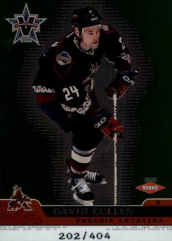 The David Cullen 2001 Pacific Vanguard #125 Base /404 Rookie card is 1 of 6 David Cullen's card variations in the 2001 Pacific Vanguard set being tracked by Sports Card Investor, including Blue /89, Premiere Date /83, Red /38, One of Ones /1, and Proofs /1.
