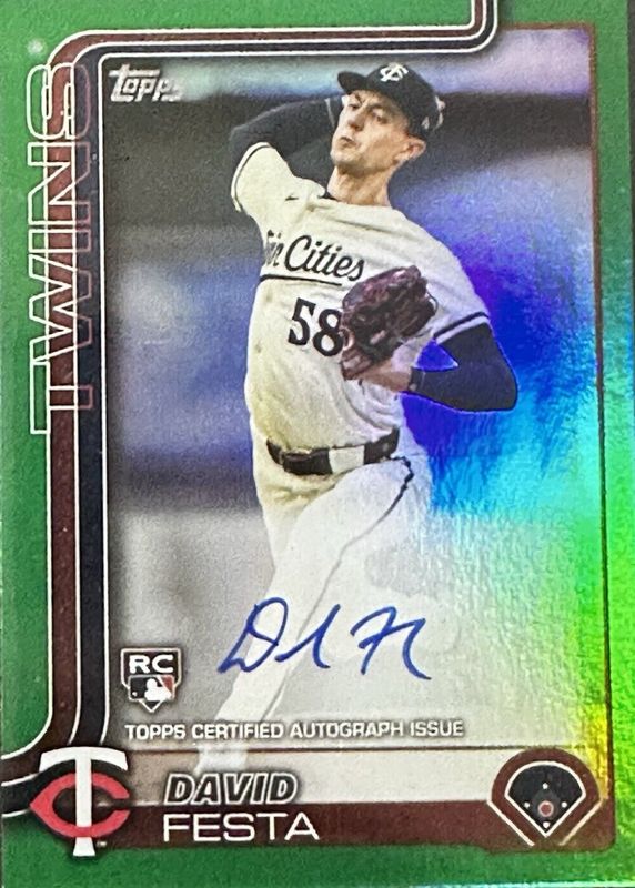 The David Festa 2025 Topps #178 Flagship Real One Autographs - Green Foil /99 Rookie card in Raw condition has not changed in price in the last 30 days and was last sold for $28.00 .