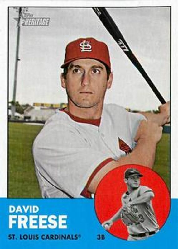 The David Freese 2012 Topps Heritage #130 Base card is 1 of 2 David Freese's card variations in the 2012 Topps Heritage set being tracked by Sports Card Investor, including Walmart Blue Border.