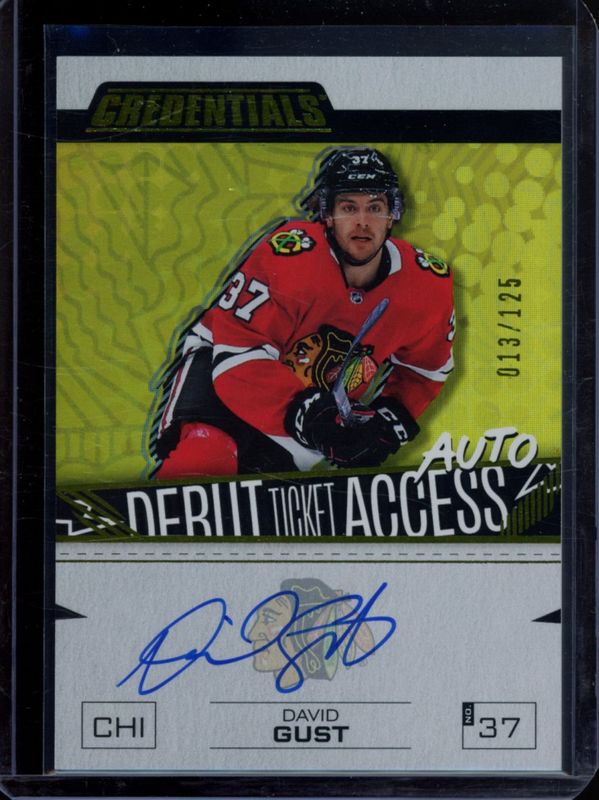 The David Gust 2023 Upper Deck Credentials #DTAA-DG Debut Ticket Access Autographs - Yellow /125 Rookie card is 1 of 29 David Gust's card variations in the 2023 Upper Deck Credentials set being tracked by Sports Card Investor, including Base /999, Debut Ticket Access Horizontal Variation Yellow, Yellow, Debut Ticket Access Horizontal Variation /799, and Red /349.