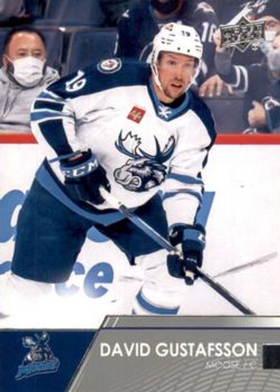 The David Gustafsson 2021 Upper Deck AHL #93 Base card is 1 of 8 David Gustafsson's card variations in the 2021 Upper Deck AHL set being tracked by Sports Card Investor, including Exclusives /100, High Gloss /10, Blue, Printing Plates - Black /1, and Printing Plates Cyan /1.
