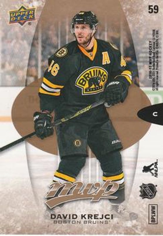 The David Krejci 2016 Upper Deck MVP #59 Puzzle Back card is 1 of 16 David Krejci's card variations in the 2016 Upper Deck MVP set being tracked by Sports Card Investor, including #59 Base, #333 Base, #59 Colors & Contours, #59 Green Script, and #59 Silver Script.