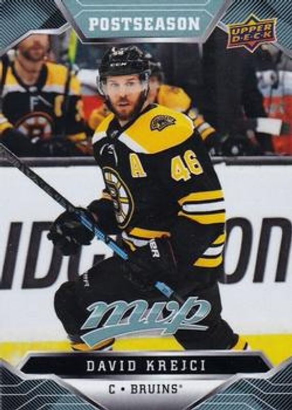 The David Krejci 2019 Upper Deck MVP #PS3 Variant Postseason card is 1 of 13 David Krejci's card variations in the 2019 Upper Deck MVP set being tracked by Sports Card Investor, including Base, Blue, Gold Script, Puzzle Backs, and Silver Script.