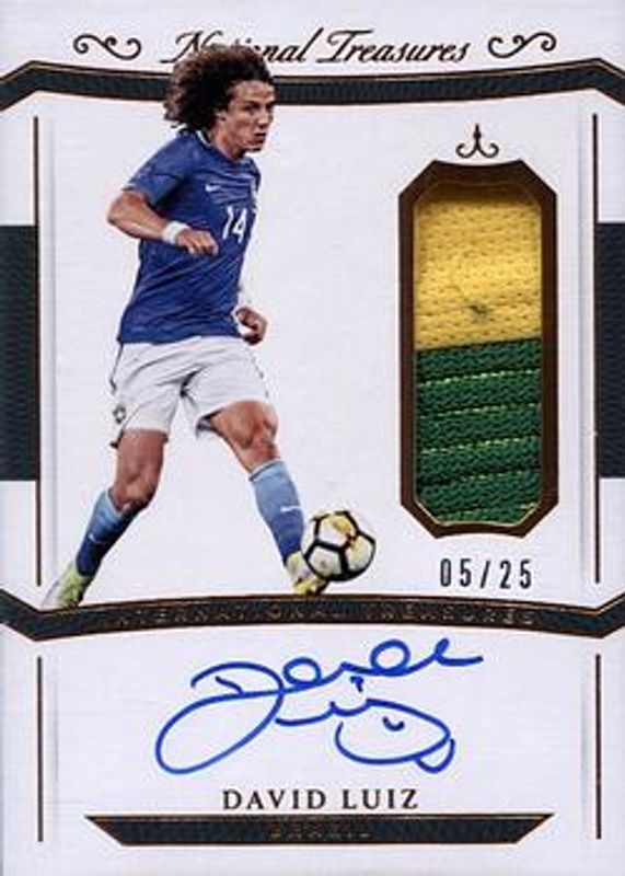 The David Luiz 2018 National Treasures #IT-DL International Treasures Material Autographs - Bronze /25 card is 1 of 38 David Luiz's card variations in the 2018 National Treasures set being tracked by Sports Card Investor, including Colossal Materials /99, International Treasures Material Autographs /99, Material Treasures /99, Penmanship Autographs /99, and Treasured Threads Relics /99.