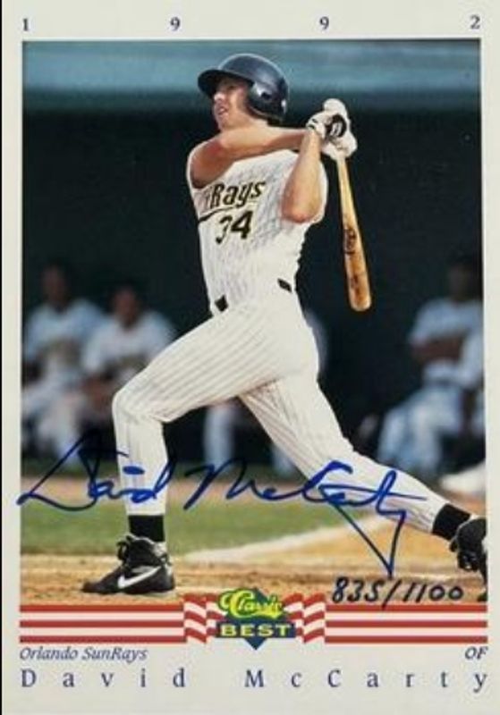 The David McCarty 1992 Classic Best Autographs /1100 Rookie card is 1 of 4 David McCarty's card variations in the 1992 Classic Best set being tracked by Sports Card Investor, including Base, Bonus - Blue, and Bonus - Red.