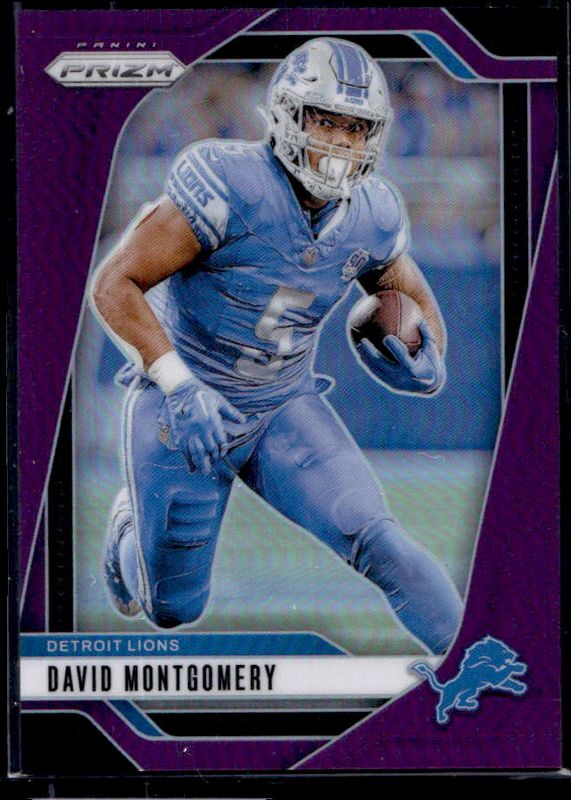 The David Montgomery 2024 Prizm #94 Purple /125 card is 1 of 83 David Montgomery's card variations in the 2024 Prizm set being tracked by Sports Card Investor, including Base, Choice Blue Yellow Green, Choice Silver, Disco, and Green.