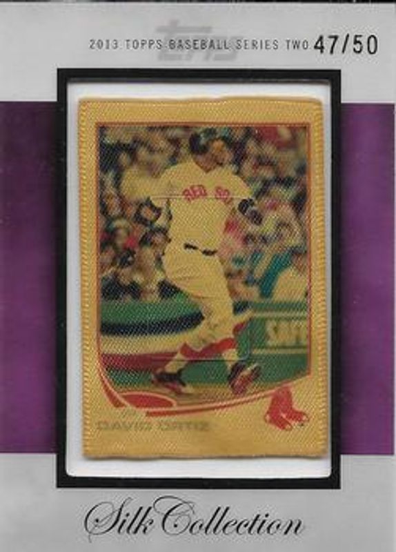The David Ortiz 2013 Topps Silk Collection /50 card is 1 of 37 David Ortiz's card variations in the 2013 Topps set being tracked by Sports Card Investor, including #TM-94 1972 Topps Minis, #595b Base, #595a Base, #CC-4 Calling Cards, and #CHR-DO Chasing History Relics.