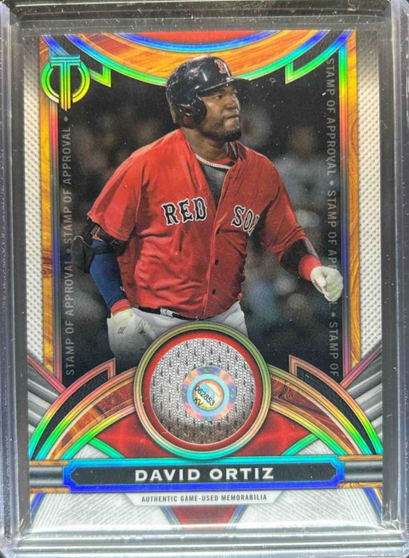 The David Ortiz 2023 Topps Tribute #SOA-DO Stamp of Approval Relics /199 card is 1 of 47 David Ortiz's card variations in the 2023 Topps Tribute set being tracked by Sports Card Investor, including Base, Green /99, Gold /75, Purple /50, and Orange /25.