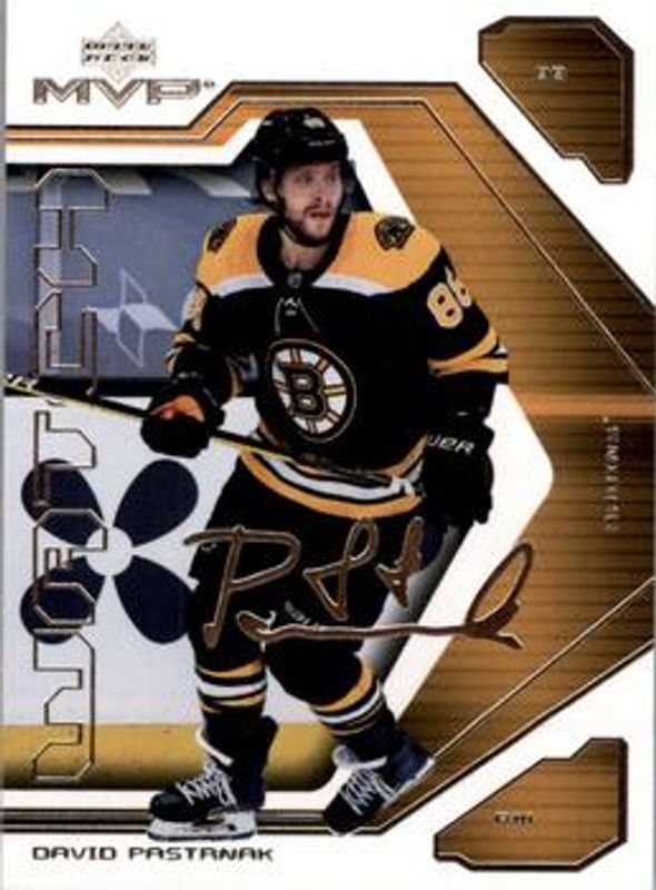 The David Pastrnak 2021 Upper Deck MVP #10 20th Anniversary card is 1 of 35 David Pastrnak's card variations in the 2021 Upper Deck MVP set being tracked by Sports Card Investor, including Base, Blue, Gold Script, Ice Battles, and Silver Script.