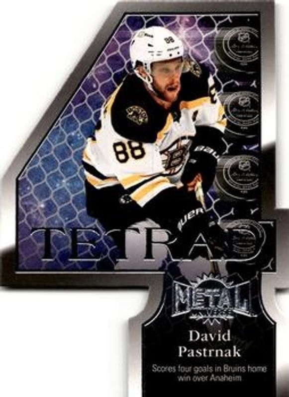 The David Pastrnak 2022 Metal Universe #TR-10 Tetrad card is 1 of 29 David Pastrnak's card variations in the 2022 Metal Universe set being tracked by Sports Card Investor, including Base, Spectrum FX Blue, Spectrum FX Purple /199, Precious Metal Gems Green /100, and Precious Metal Gems Red /100.