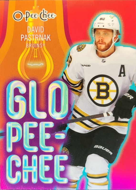 The David Pastrnak 2024 O-Pee-Chee #GLO-5 Glo-Pee-Chee card is 1 of 56 David Pastrnak's card variations in the 2024 O-Pee-Chee set being tracked by Sports Card Investor, including #496 Base, #501 Base, #496 Blue Border, #501 Blue Border, and #496 Red Border.