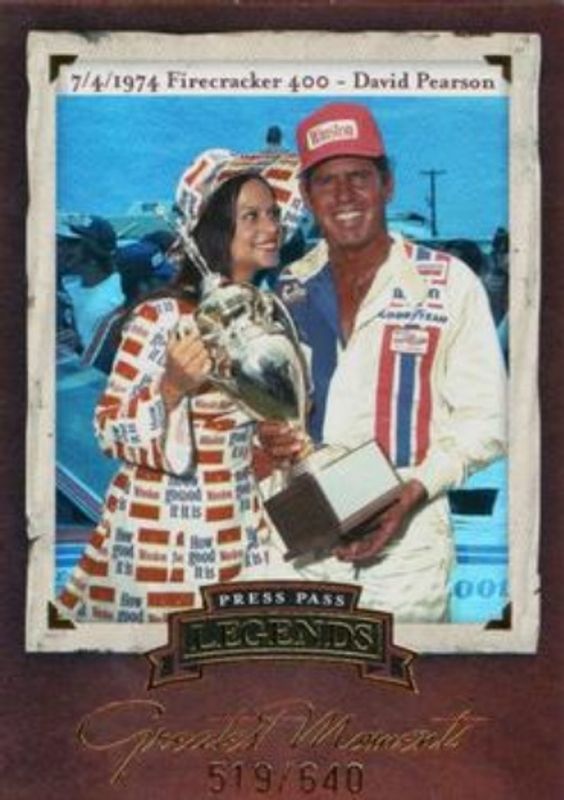The David Pearson 2005 Press Pass Legends #GM-2 Greatest Moments /640 card is 1 of 19 David Pearson's card variations in the 2005 Press Pass Legends set being tracked by Sports Card Investor, including Base, Blue /1890, Gold /750, Holofoil /100, and eBay Previews /5.