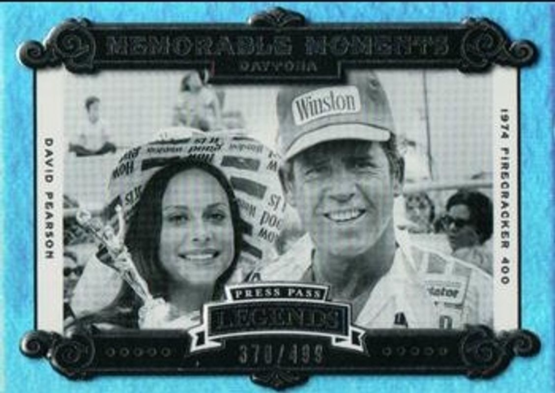 The David Pearson 2007 Press Pass Legends #MM-10 Memorable Moments Silver /499 card is 1 of 38 David Pearson's card variations in the 2007 Press Pass Legends set being tracked by Sports Card Investor, including #60 Base, #15 Base, #S-60 Solo, #S-15 Solo, and #B-60 Blue /999.