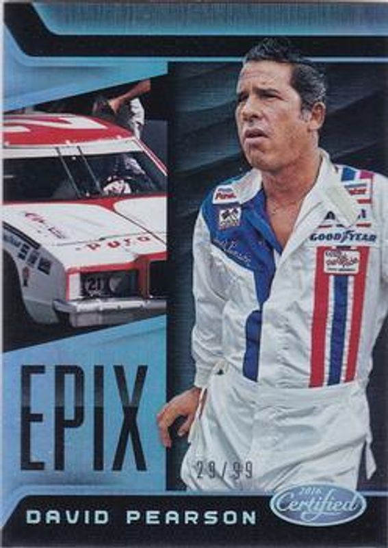 The David Pearson 2016 Certified NASCAR #E20 Epix - Mirror Silver /99 card is 1 of 36 David Pearson's card variations in the 2016 Certified NASCAR set being tracked by Sports Card Investor, including Base /99, Mirror Red /25, Mirror Blue /20, Mirror Gold /15, and Mirror Orange /15.