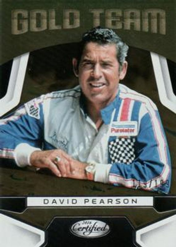 The David Pearson 2016 Certified NASCAR #GT3 Gold Team /199 card is 1 of 36 David Pearson's card variations in the 2016 Certified NASCAR set being tracked by Sports Card Investor, including Base /99, Mirror Red /25, Mirror Blue /20, Mirror Gold /15, and Mirror Orange /15.