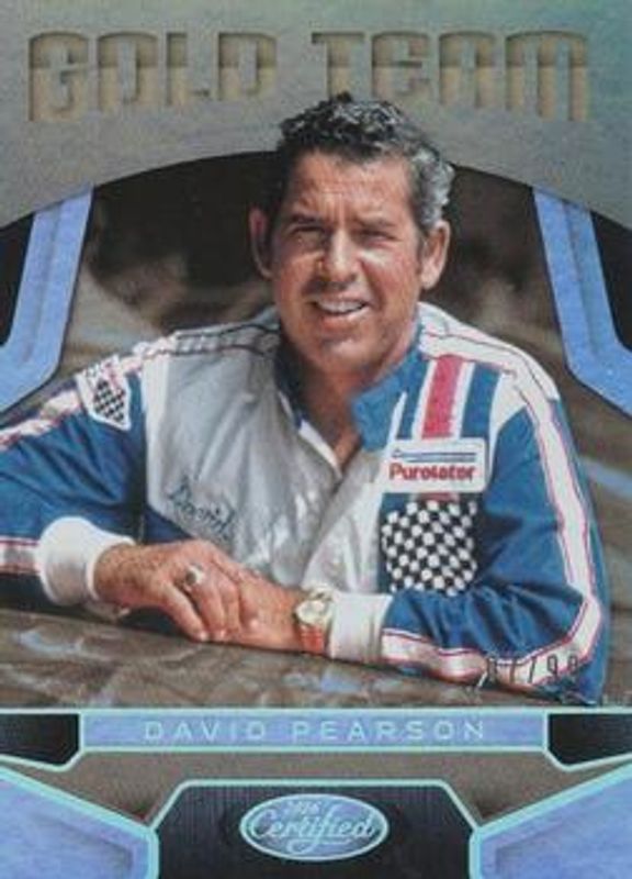 The David Pearson 2016 Certified NASCAR #GT3 Gold Team - Mirror Silver /99 card is 1 of 36 David Pearson's card variations in the 2016 Certified NASCAR set being tracked by Sports Card Investor, including Base /99, Mirror Red /25, Mirror Blue /20, Mirror Gold /15, and Mirror Orange /15.