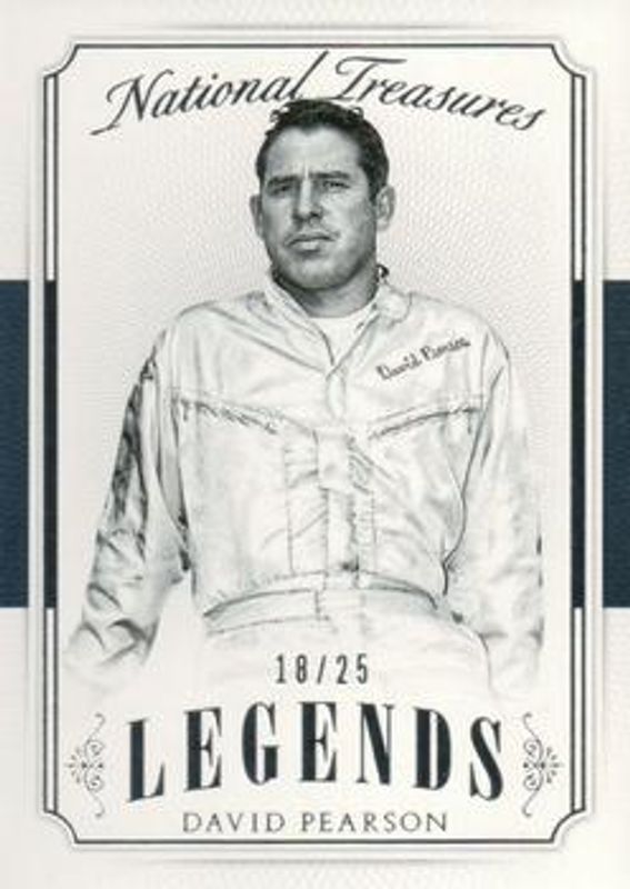 The David Pearson 2016 National Treasures NASCAR #44 Base /25 card is 1 of 9 David Pearson's card variations in the 2016 National Treasures NASCAR set being tracked by Sports Card Investor, including Century Silver /20, Century Gold /15, Century Black /5, Century Blue /1, and Printing Plates Black /1.