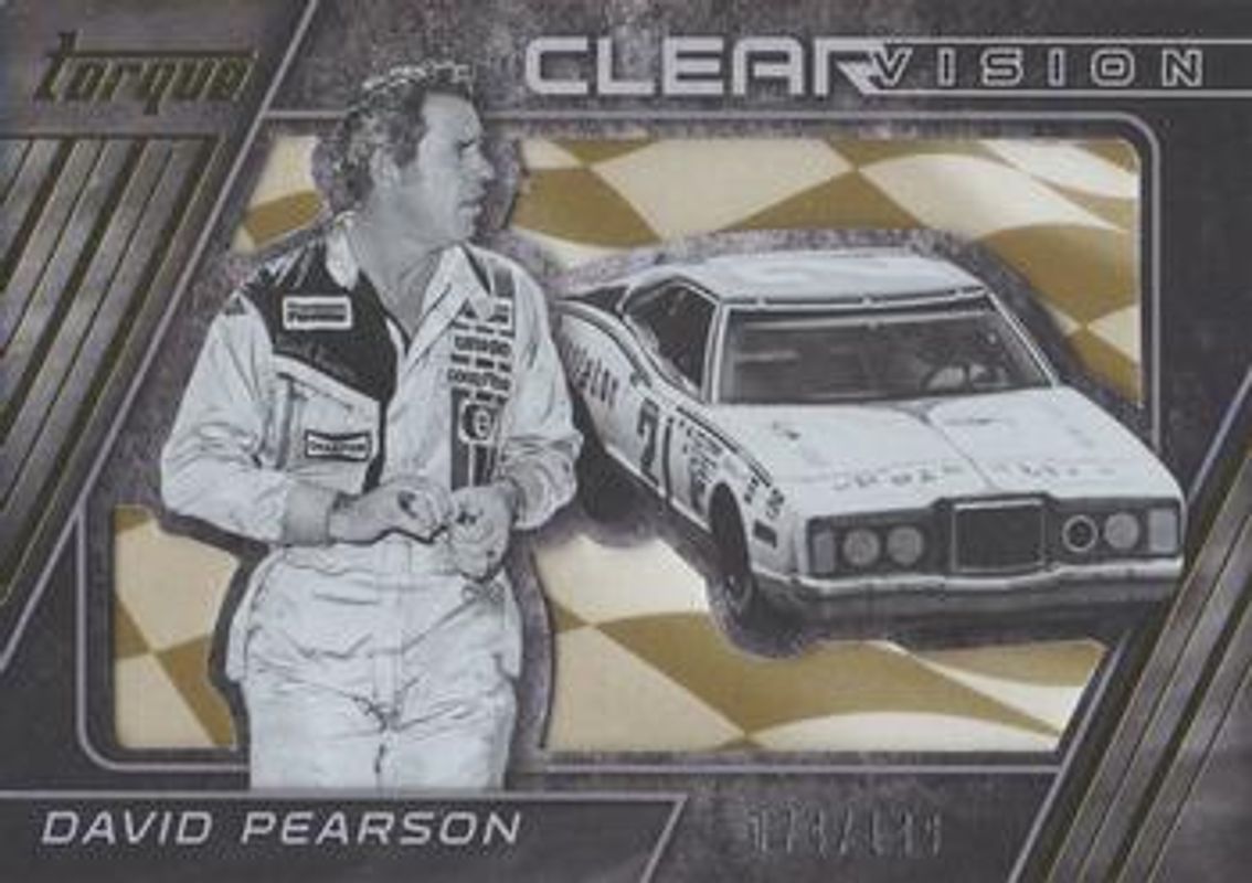 The David Pearson 2016 Torque NASCAR #35 Clear Vision Gold /149 card is 1 of 41 David Pearson's card variations in the 2016 Torque NASCAR set being tracked by Sports Card Investor, including Base, Gold, Blue /125, Red /99, and Artist Proof /50.