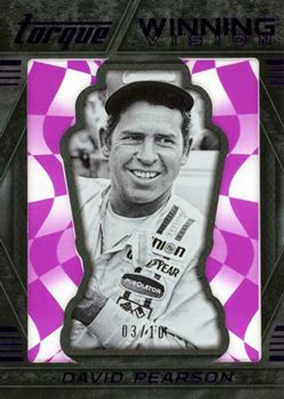 The David Pearson 2016 Torque NASCAR #WV25 Winning Vision Purple /10 card is 1 of 41 David Pearson's card variations in the 2016 Torque NASCAR set being tracked by Sports Card Investor, including Base, Gold, Blue /125, Red /99, and Artist Proof /50.