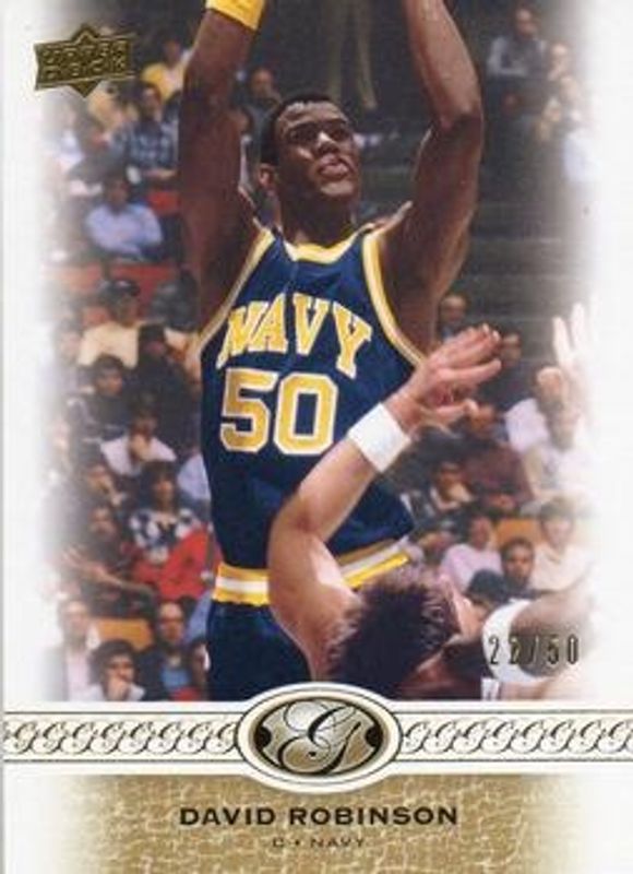 The David Robinson 2011 Upper Deck All Time Greats #62 Base /50 card is 1 of 54 David Robinson's card variations in the 2011 Upper Deck All Time Greats set being tracked by Sports Card Investor, including #63 Base /50, #64 Base /50, #65 Base /50, #66 Base /50, and #67 Base /50.