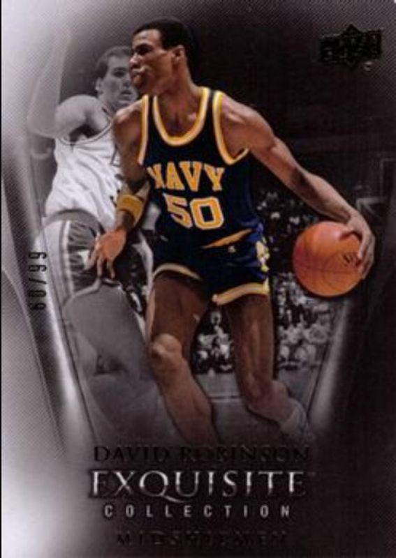 The David Robinson 2011 Upper Deck Exquisite Collection #14 Base /99 card is 1 of 20 David Robinson's card variations in the 2011 Upper Deck Exquisite Collection set being tracked by Sports Card Investor, including #14 Gold /25, #14 Holo /1, #D-DR Dimensions Autographs, #D-DA Dimensions Autographs, and #CB-DR Championship Bling /99.