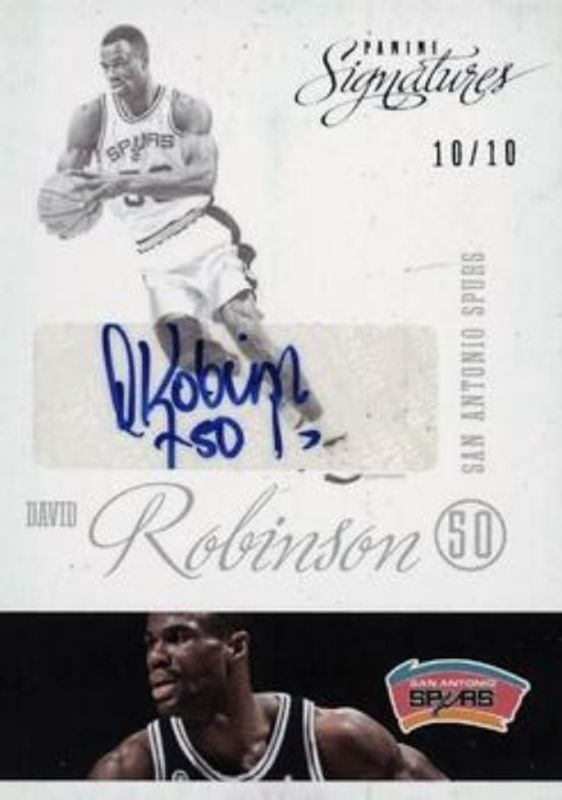 The David Robinson 2012 Panini Signatures #148 Signatures /10 card is 1 of 42 David Robinson's card variations in the 2012 Panini Signatures set being tracked by Sports Card Investor, including Signatures Die-Cut Green, Signatures Die-Cut Platinum, Signatures Die-Cut Red, Signatures Film Green, and Signatures Film Red.