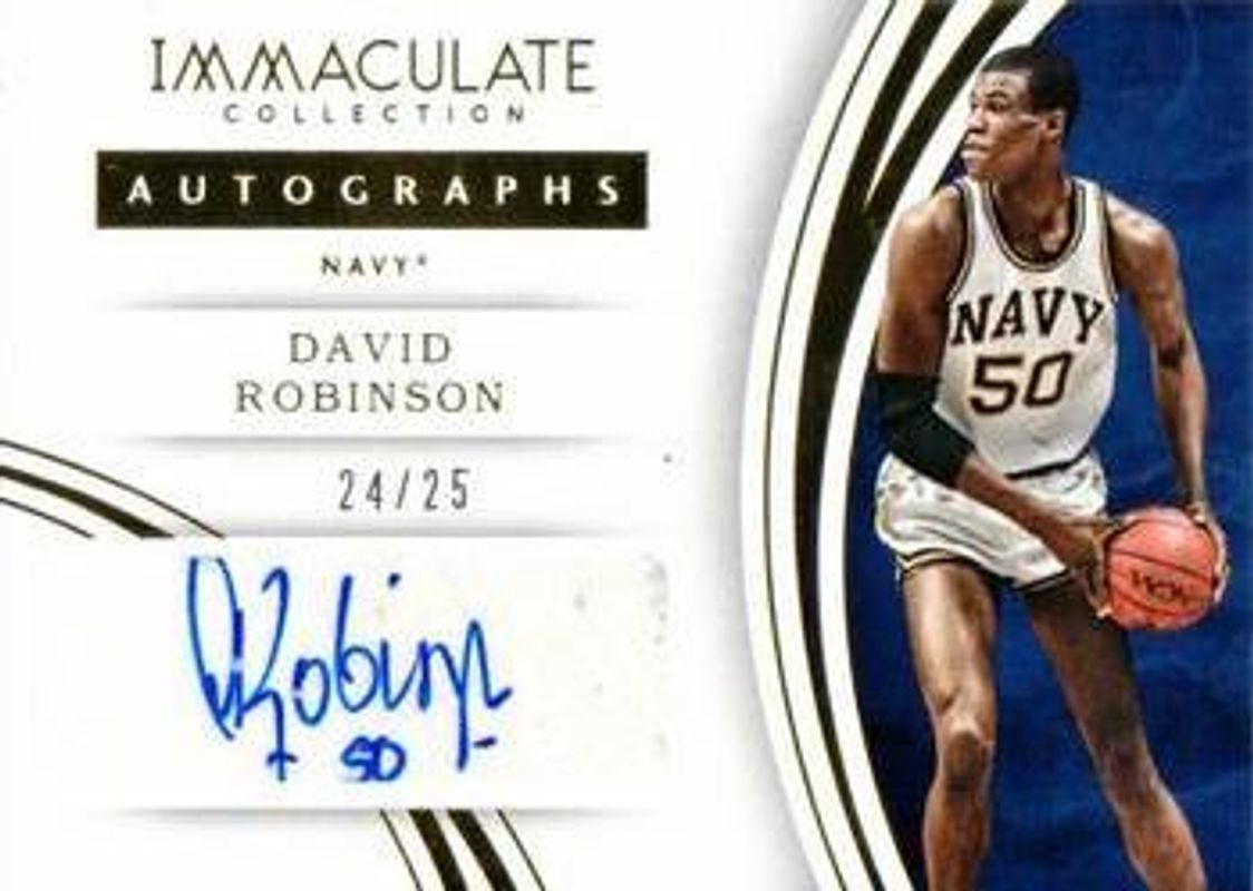 The David Robinson 2016 Immaculate Collegiate #97 Autographs /25 card is 1 of 5 David Robinson's card variations in the 2016 Immaculate Collegiate set being tracked by Sports Card Investor, including Autographs - Red /10, Autographs - Blue /5, Autographs - Gold /1, and Autographs - Platinum /1.