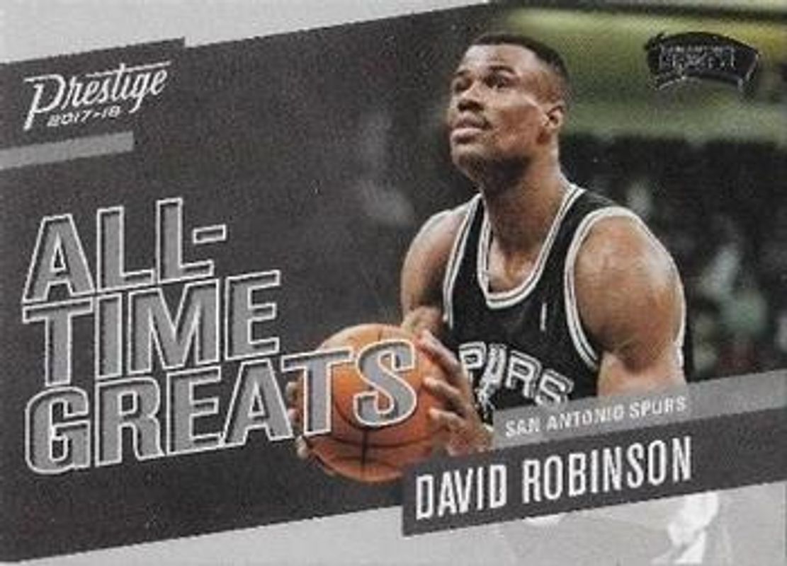 The David Robinson 2017 Prestige #13 All Time Greats card is 1 of 7 David Robinson's card variations in the 2017 Prestige set being tracked by Sports Card Investor, including All Time Greats - Crystal, All Time Greats - Horizon, All Time Greats - Mist, All Time Greats - Rain, and All Time Greats - Crystal Gold /10.