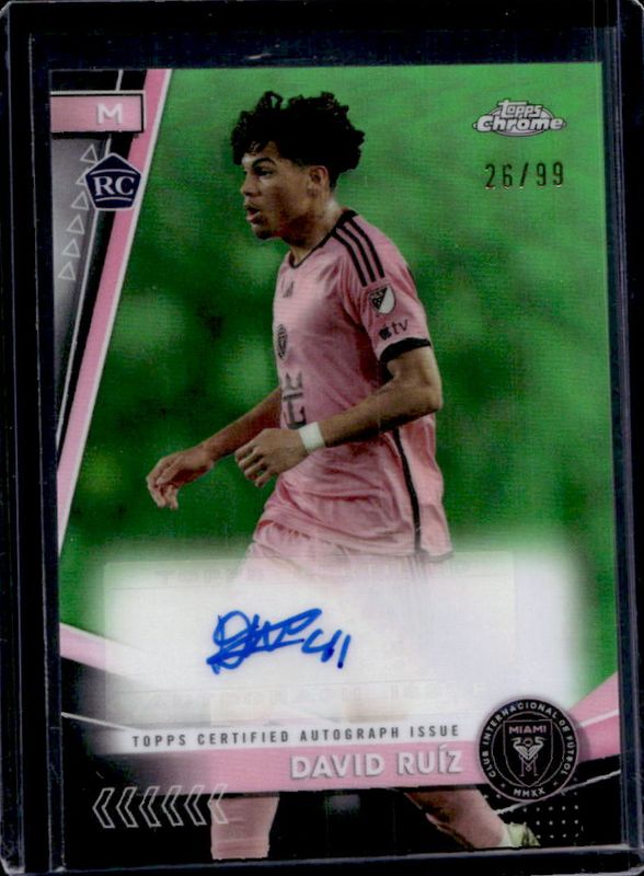 The David Ruiz 2024 Topps Chrome MLS #CA-DR Chrome Autographs - Neon Green Refractor /99 card is 1 of 63 David Ruiz's card variations in the 2024 Topps Chrome MLS set being tracked by Sports Card Investor, including #133 Base, #78 Base, #78 Aqua Lava Refractor, #133 Aqua Lava Refractor, and #133 Gold Lava Refractor.