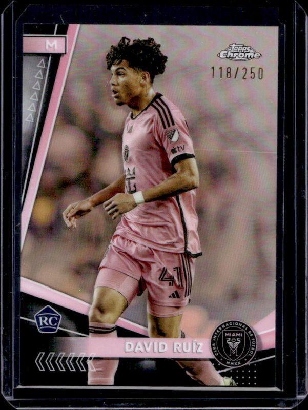 The David Ruiz 2024 Topps Chrome MLS #78 Rose Gold Refractor /250 card is 1 of 63 David Ruiz's card variations in the 2024 Topps Chrome MLS set being tracked by Sports Card Investor, including #133 Base, #78 Base, #78 Aqua Lava Refractor, #133 Aqua Lava Refractor, and #133 Gold Lava Refractor.