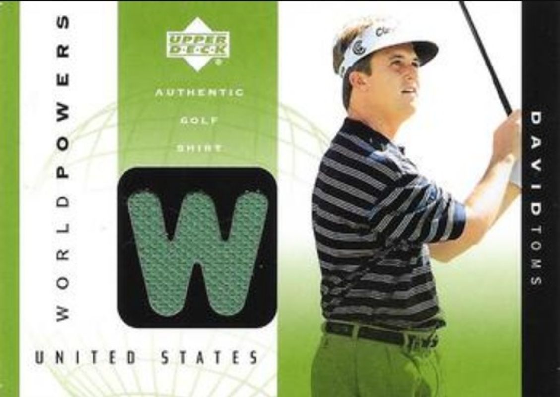 The David Toms 2003 Upper Deck #WP1-DT World Powers Single Shirts card is 1 of 9 David Toms' card variations in the 2003 Upper Deck set being tracked by Sports Card Investor, including #9 Base, #94 Base, #65 Base, #79 Base, and #GE-DT Golf Gear - Eagle.