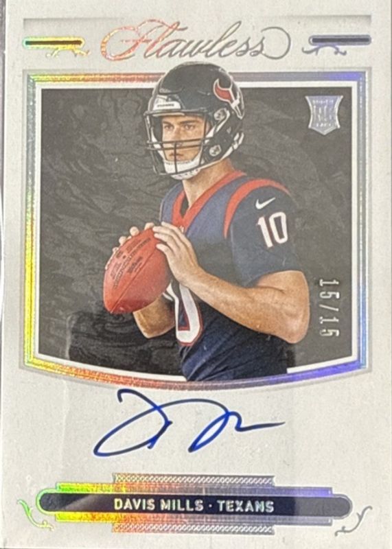 This card is 1 of 25 Davis Mills' card variations in the 2021 Flawless set being tracked by Sports Card Investor, including Rookie Dual Patch Auto (/20), Rookie Dual Patch Auto - Emerald (/3), Rookie Dual Patch Auto - Ruby (/10), Rookie Dual Patch Auto - Sapphire (/5), and Rookie Dual Patch Auto - Silver (/15).