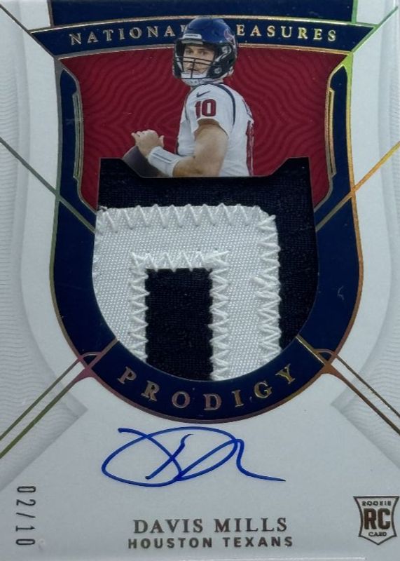 The Davis Mills 2021 National Treasures #PPA-DM Prodigy Patch Autographs - Holo Gold /10 Rookie card in Raw condition has not changed in price in the last 30 days and was last sold for $46.10 .