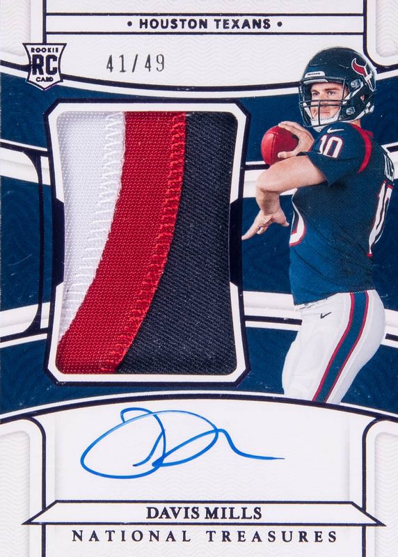 This card is 1 of 44 Davis Mills' card variations in the 2021 National Treasures set being tracked by Sports Card Investor, including Rookie Patch Auto /99, Rookie Patch Auto - Green Jersey Number (/10), Rookie Patch Auto - Holo Silver /25, Rookie Patch Auto - Stars & Stripes Holo Silver /25, and Rookie Patch Auto - Midnight /20.