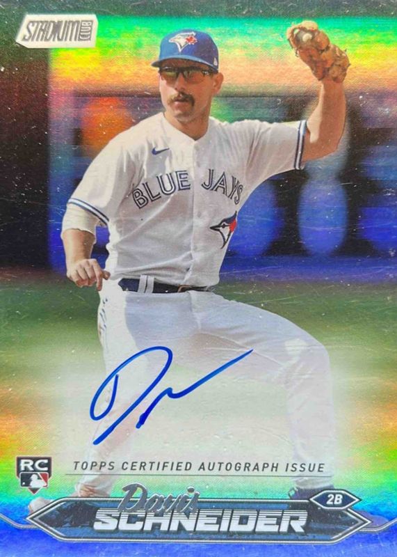 The Davis Schneider 2024 Stadium Club #SCBA-DS Autographs - Rainbow Foilboard /10 Rookie card in Raw condition has not changed in price in the last 30 days and was last sold for $29.99 .