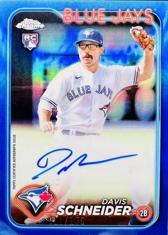 The Davis Schneider 2024 Topps Chrome #RA-DSC Rookie Autographs - Blue Refractor /150 card in Raw condition has not changed in price in the last 30 days and was last sold for $15.07 .