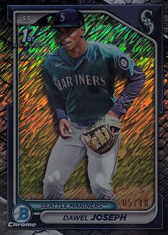 This card is 1 of 51 Dawel Joseph's card variations in the 2024 Bowman Chrome set being tracked by Sports Card Investor, including Prospects (1st), Prospects - Shimmer Refractor (1st), Prospects - Refractor /499 (1st), Prospects - Speckle Refractor /299 (1st), and Prospects - Purple Refractor /250 (1st).
