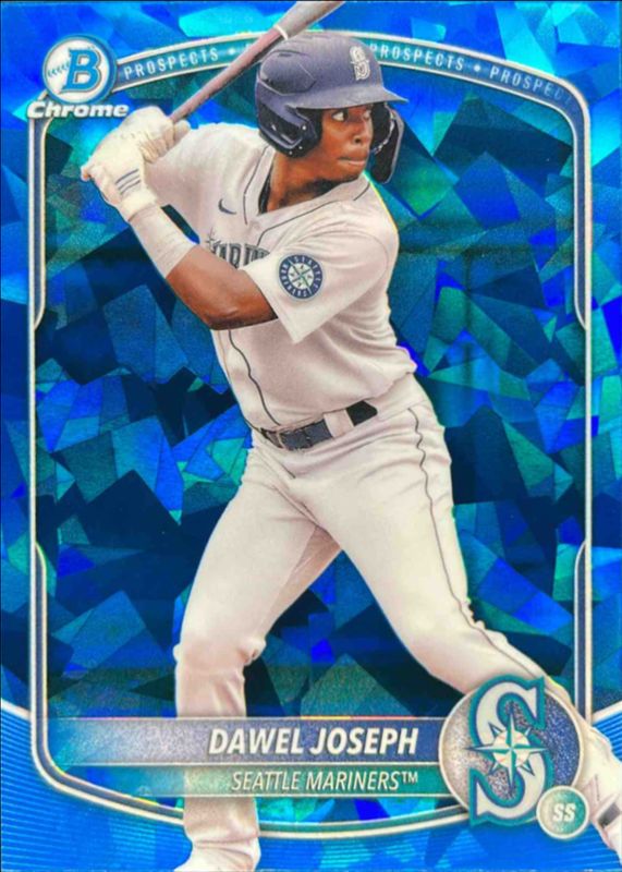 The Dawel Joseph 2025 Bowman Sapphire Edition #BCP-8 Chrome Prospects card is 1 of 9 Dawel Joseph's card variations in the 2025 Bowman Sapphire Edition set being tracked by Sports Card Investor, including Chrome Prospects - Green Refractor /99, Chrome Prospects - Yellow Refractor /75, Chrome Prospects - Gold Refractor /50, Chrome Prospects - Orange Refractor /25, and Chrome Prospects - Black Refractor /10.