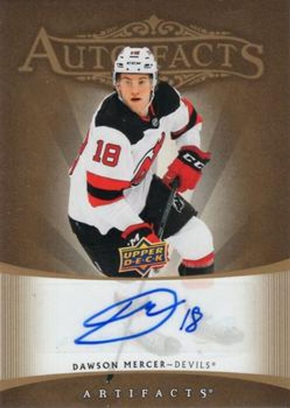 The Dawson Mercer 2022 Upper Deck Artifacts #RAF-DM 2005 Retro Auto Facts card is 1 of 25 Dawson Mercer's card variations in the 2022 Upper Deck Artifacts set being tracked by Sports Card Investor, including Base /999, Turquoise, Ruby /499, Copper /299, and Royal Blue /199.