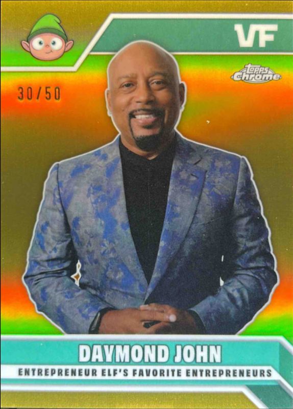 The Daymond John 2025 Topps Chrome VeeFriends #EE-DJ Entrepreneur Elf’s Favorite Entrepreneurs - Gold Refractor /50 card is 1 of 10 Daymond John's card variations in the 2025 Topps Chrome VeeFriends set being tracked by Sports Card Investor, including Entrepreneur Elf’s Favorite Entrepreneurs, Entrepreneur Elf’s Favorite Entrepreneurs Autographs, Entrepreneur Elf’s Favorite Entrepreneurs - VeeFriends Green Refractor /99, Entrepreneur Elf’s Favorite Entrepreneurs - Orange Refractor /25, and Entrepreneur Elf’s Favorite Entrepreneurs - Black Refractor /10.