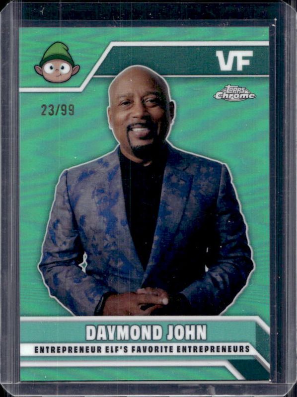The Daymond John 2025 Topps Chrome VeeFriends #EE-DJ Entrepreneur Elf’s Favorite Entrepreneurs - VeeFriends Green Refractor /99 card is 1 of 10 Daymond John's card variations in the 2025 Topps Chrome VeeFriends set being tracked by Sports Card Investor, including Entrepreneur Elf’s Favorite Entrepreneurs, Entrepreneur Elf’s Favorite Entrepreneurs Autographs, Entrepreneur Elf’s Favorite Entrepreneurs - Gold Refractor /50, Entrepreneur Elf’s Favorite Entrepreneurs - Orange Refractor /25, and Entrepreneur Elf’s Favorite Entrepreneurs - Black Refractor /10.
