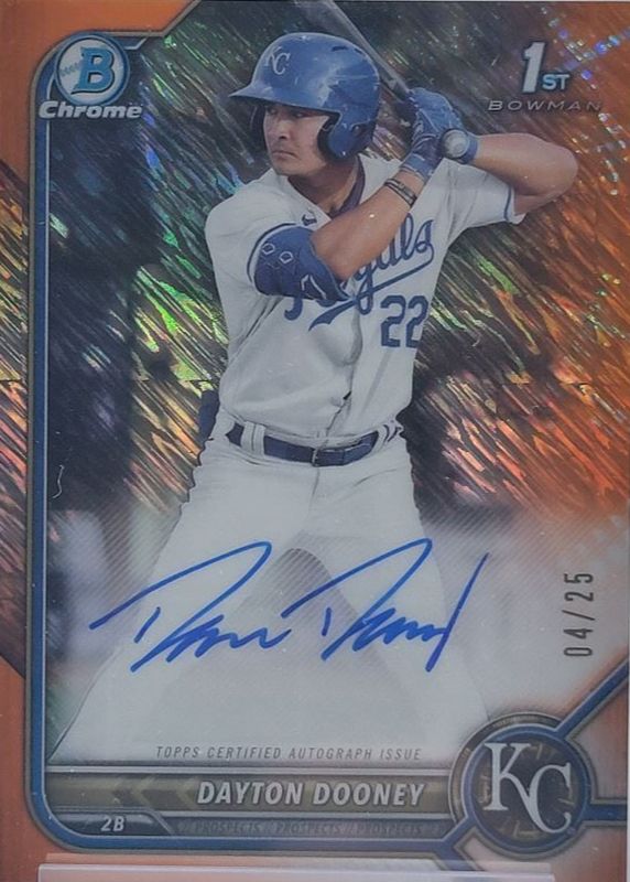 The Dayton Dooney 2022 Bowman #CPA-DDO Chrome Prospect Auto - Orange Shimmer Refractor /25 (1st) card in Raw condition has not changed in price in the last 30 days and was last sold for $7.26 .