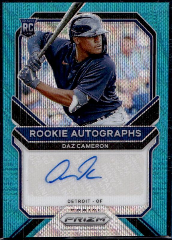 The Daz Cameron 2021 Prizm #RA-DC Rookie Autographs - Teal Wave /50 card is 1 of 70 Daz Cameron's card variations in the 2021 Prizm set being tracked by Sports Card Investor, including Base, Blue, Blue Velocity, Carolina Blue, and Cosmic Haze.