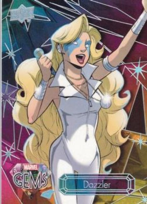 The Dazzler 2016 Upper Deck Marvel Gems #8 Base /225 card is 1 of 9 Dazzler's card variations in the 2016 Upper Deck Marvel Gems set being tracked by Sports Card Investor, including Ruby /99, Sapphire /25, Topaz /10, Printing Plates Black /1, and Printing Plates Cyan /1.