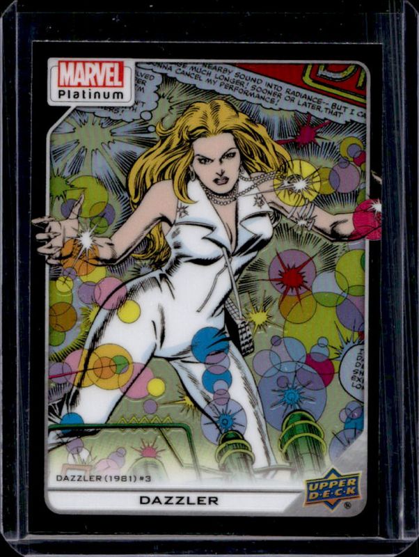 The Dazzler 2023 Upper Deck Marvel Platinum #175 Black Rainbow card is 1 of 30 Dazzler's card variations in the 2023 Upper Deck Marvel Platinum set being tracked by Sports Card Investor, including Base, Blue Rainbow, Blue Surge, Purple Rainbow, and Rainbow.