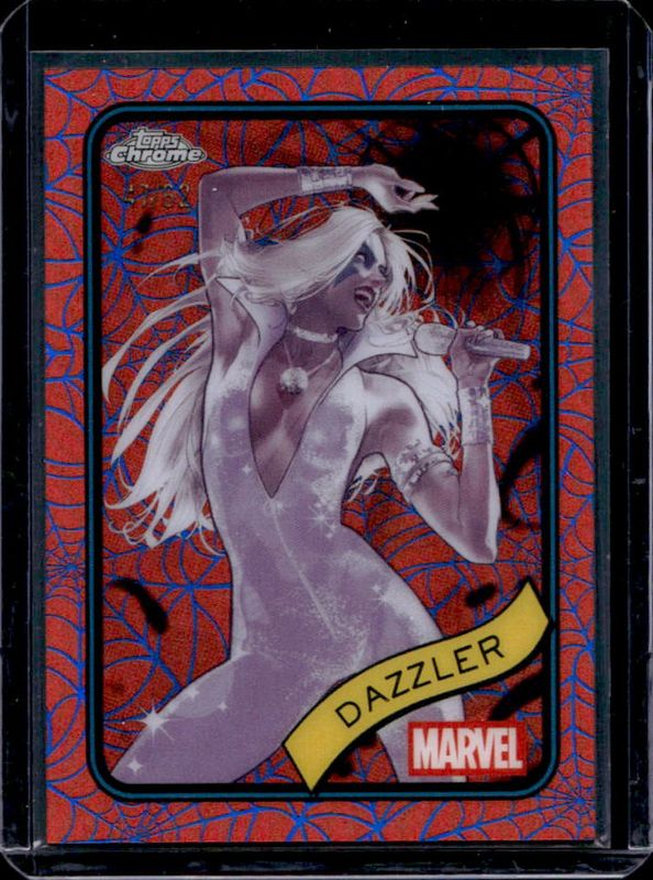 The Dazzler 2025 Topps Chrome #52 Blue & Red Spider Web Refractor /62 card is 1 of 29 Dazzler's card variations in the 2025 Topps Chrome set being tracked by Sports Card Investor, including Base, Refractor, Yellow Lava Refractor, Spider Web Refractor /399, and Blue Refractor /299.