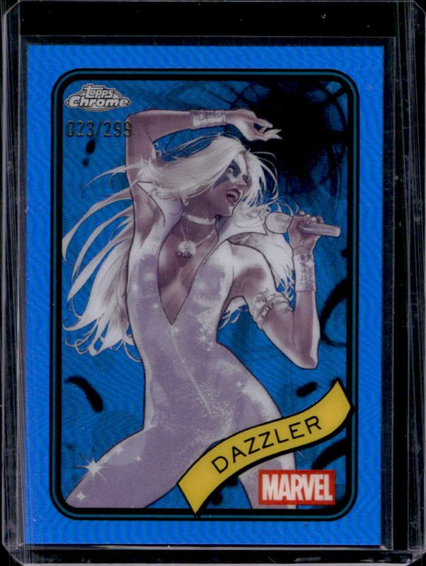 The Dazzler 2025 Topps Chrome #52 Blue Refractor /299 card is 1 of 29 Dazzler's card variations in the 2025 Topps Chrome set being tracked by Sports Card Investor, including Base, Refractor, Yellow Lava Refractor, Spider Web Refractor /399, and Blue & Green Shimmer Refractor /199.
