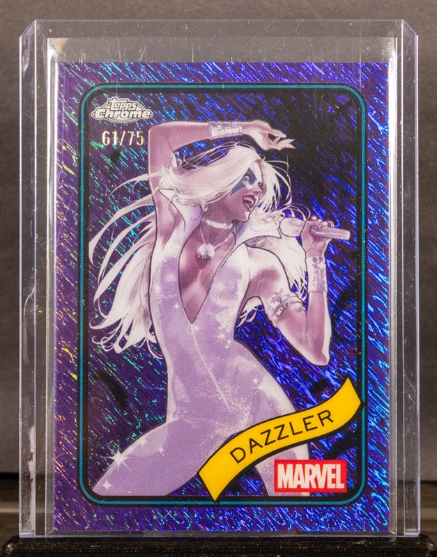 The Dazzler 2025 Topps Chrome #52 Purple Shimmer Refractor /75 card is 1 of 29 Dazzler's card variations in the 2025 Topps Chrome set being tracked by Sports Card Investor, including Base, Refractor, Yellow Lava Refractor, Spider Web Refractor /399, and Blue Refractor /299.