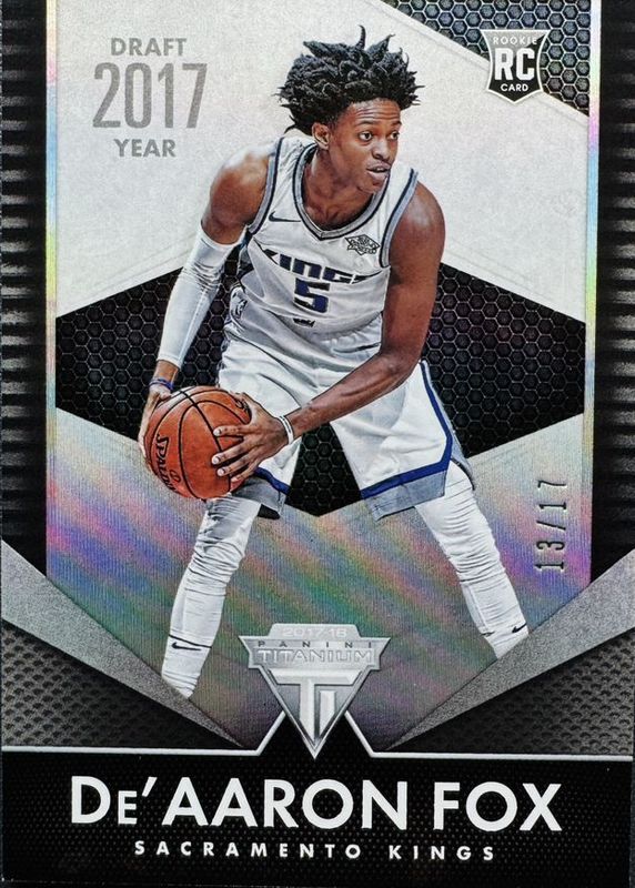 The De'Aaron Fox 2017 Chronicles #201 Titanium Draft Year /17 Rookie card in Raw condition has not changed in price in the last 30 days and was last sold for $19.50 .