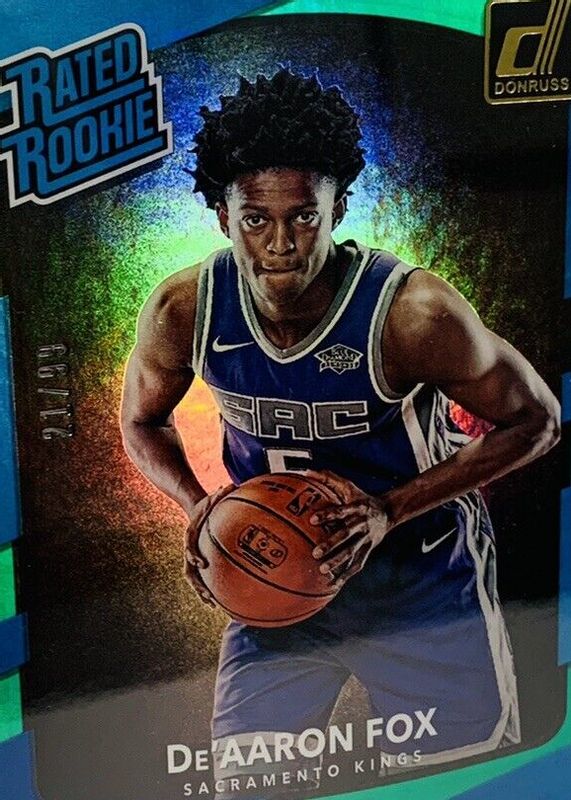 The De'Aaron Fox 2017 Donruss #196 Holo Green Laser /99 Rookie card in Raw condition has not changed in price in the last 30 days and was last sold for $28.89 .